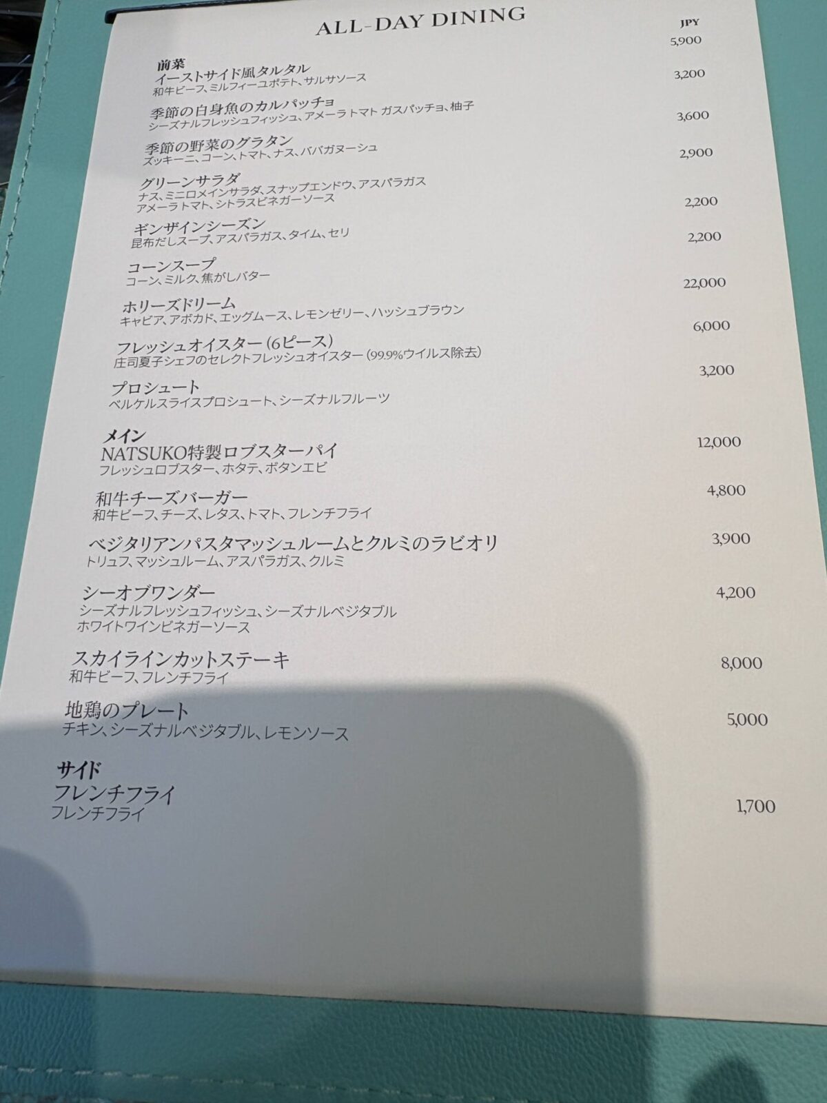 その他、OPTIONで注文する飲み物ドリンクのメニューもあったけど写真撮り忘れ。珈琲単品だけで1500円ぐらいだったような・・・シャンパンは4800円。カクテルも3000円ぐらいだった。全体的に高め。