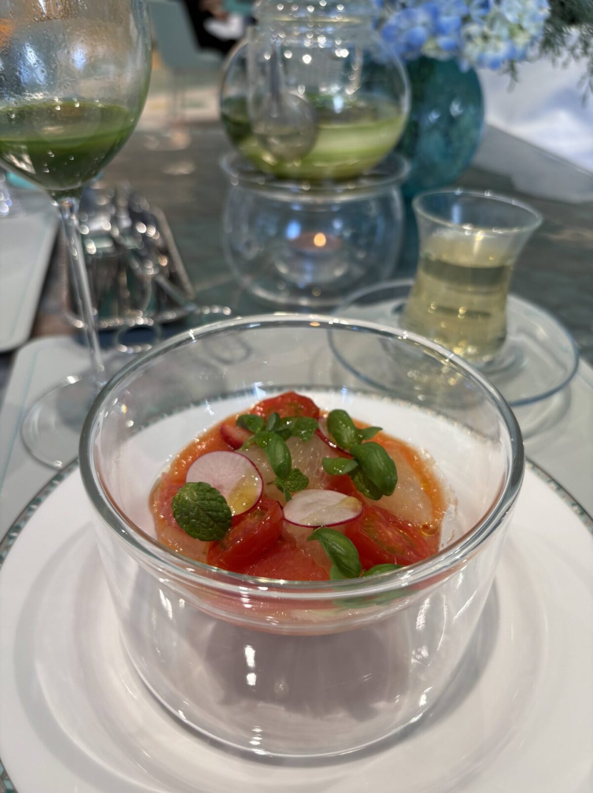 お出汁のスープで感激していたら映えるフルーツサラダが出てきた。基本1品1品時間差でサーヴされる。さながらフレンチレストランのごとく。