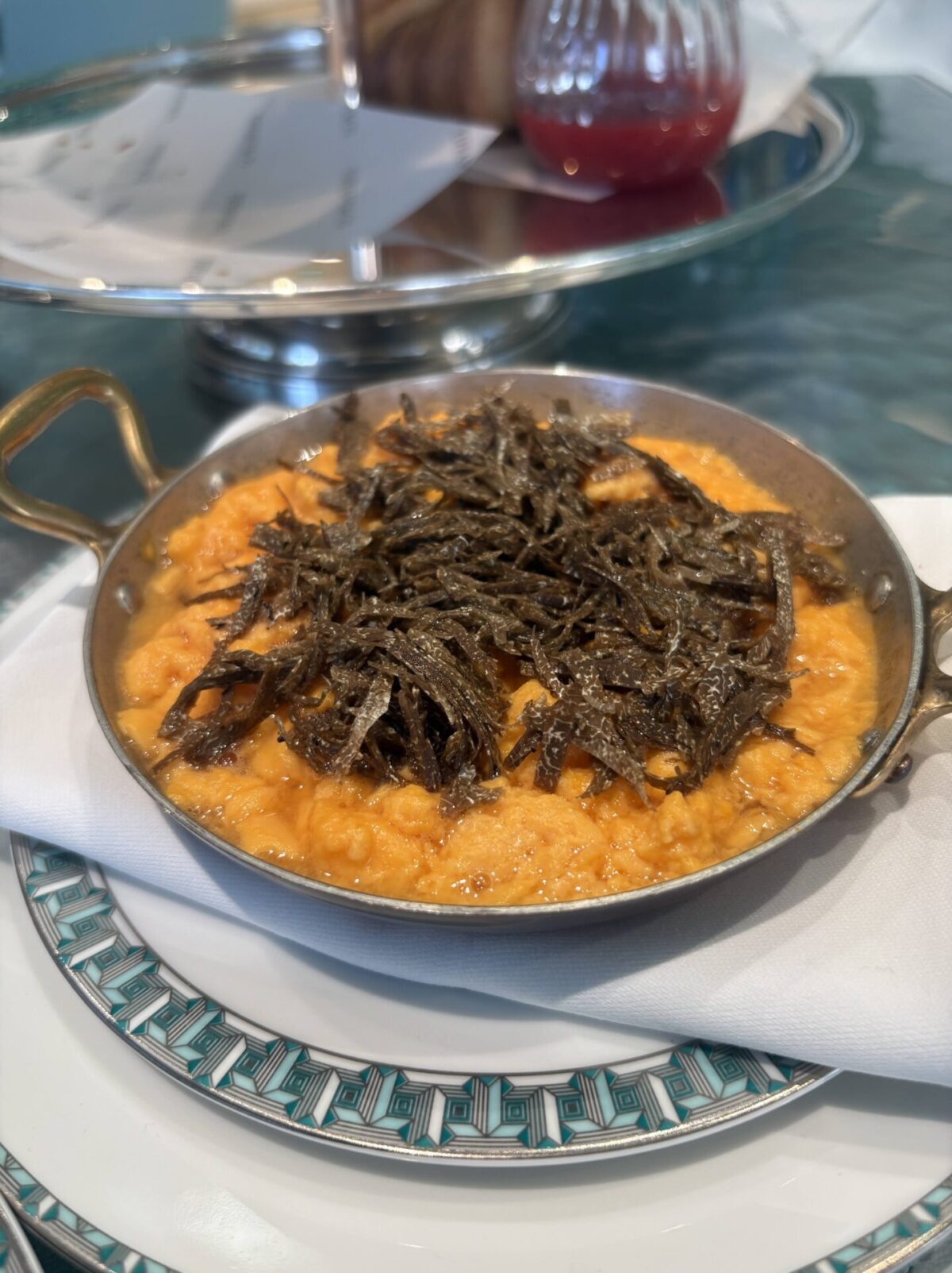OPTIONでトリュフを追加してみた(1500円)。香りがすごい。一瞬、糸昆布に見えなくもないが?まぎれもなく黒トリュフ。スクランブルエッグは茶碗蒸しみたいなお味だった。個人的にはオムレツにしてほしい所。(色々うるさい私)このくずした茶碗蒸しみたいな味の卵料理とクロワッサン&ブリオッシュもイマイチ合わないような・・・・